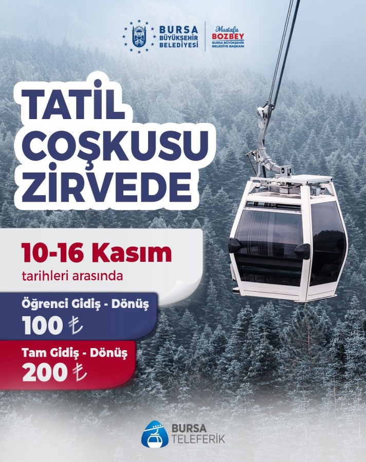 "Bursalı minikler, aileler ve gençler ara tatilin keyfini doyasıya yaşasın, Uludağ ile tanışmayan kalmasın diye 10-16 Kasım tarihleri arasında, avantajlı fiyatı ile Bursa Teleferik yolculuğuna bekliyoruz! Öğrenci gidiş-dönüş: 100 TL Tam gidiş-dönüş: 200 TL"