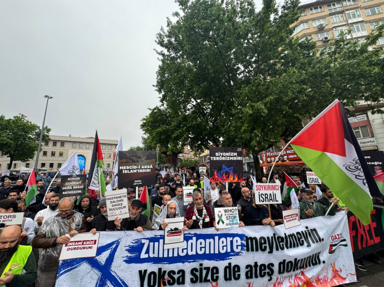 Türk ve Filistin bayrakları taşıyan katılımcılar, pankart ve sloganlarla İsrail'i protesto etti.