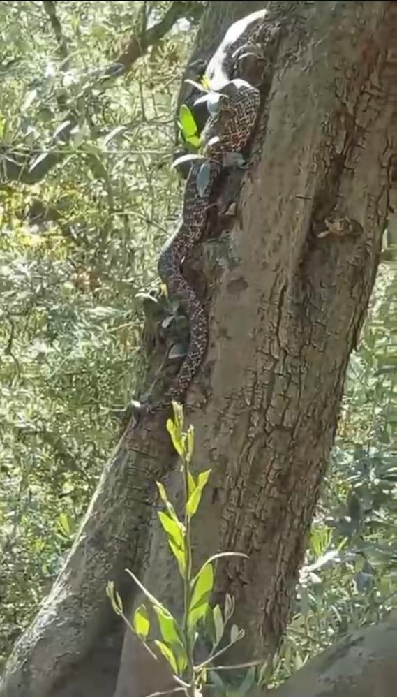 İznik ilçesinin Hisardere Mahallesinde 2,5 metrelik yılan, zeytin ağacına tırmandı. Tarlaya çalışmak için gelenler ağaçtaki yılanı görünce gözlerine inanamadı. Cüssesiyle insanın içini ürperten yılan, çalışanlarca cep telefonu ile kayda alındı. Dalların arasında ilerleyen yılan daha sonra gözden kayboldu.