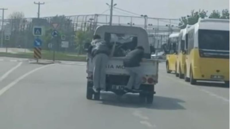 Olay, Gürsu ilçesinde meydana geldi. Canlarını hiçe sayan 2 genç, kasalı kamyonetin arkasına tutunarak ilerlemeye başladı. O anları gören diğer sürücüler, kamyonet sürücüsünü korna ile uyarsa da sonuç alamadı. Çocukların tehlikeli oyunu, saniye saniye amatör kamera ile kaydedildi.