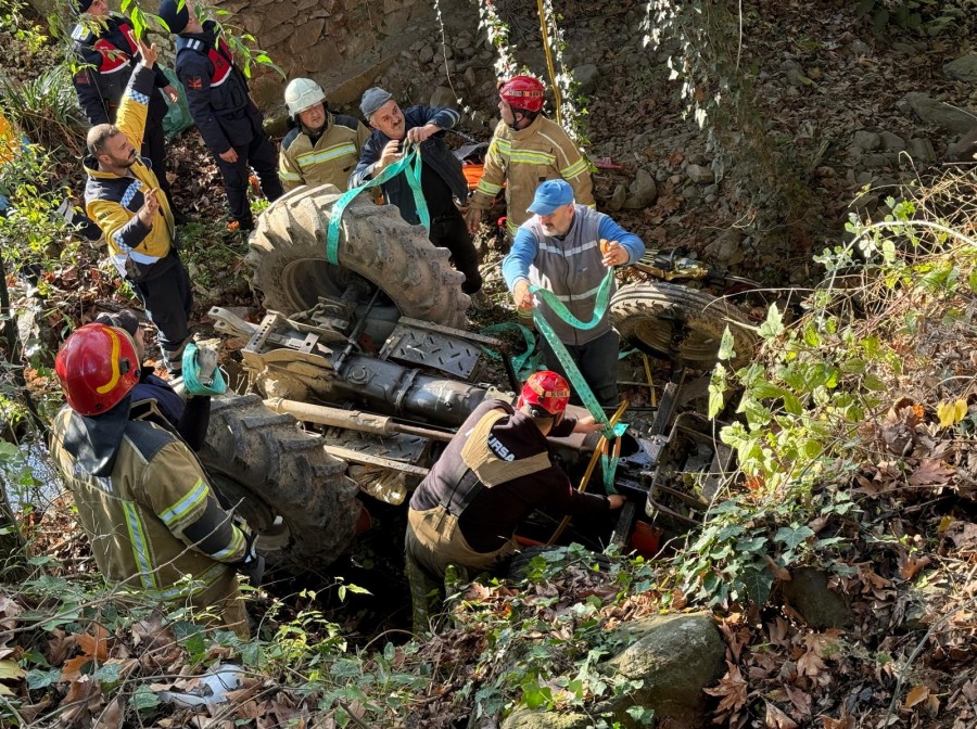 Olay yerine ulaşan kurtarma ekipleri, traktörün altında kalan yaşlı sürücüyü çıkarmak için yoğun çaba harcadı.