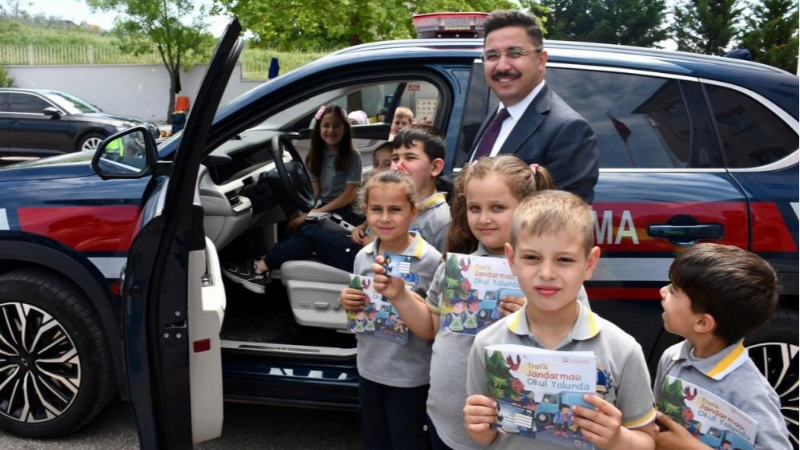 Etkinlik kapsamında öğrencilere çeşitli bilgilendirici materyaller dağıtılırken, İlçe Jandarma Komutanlığı'nın envanterindeki yerli ve milli otomobil Togg da öğrencilerin ilgisini çekti. Minikler, Togg ile hatıra fotoğrafları çektirerek keyifli anlar yaşadı.