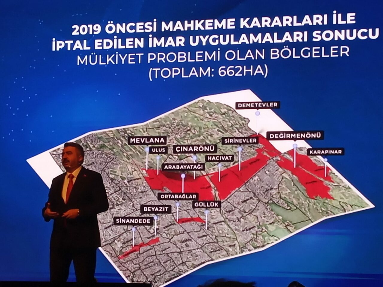 Ankara Caddesi üzerindeki 13 mahalleyi kapsayacak geniş çaplı bir dönüşüm planı hazırladıklarını da belirten Yılmaz, “Ayrık nizam ve geniş yollar üreten bir yaklaşımla ilerliyoruz. Mevlana Mahallesi’nde 100 bin metrekarelik alanda dönüşüme başladık” dedi.