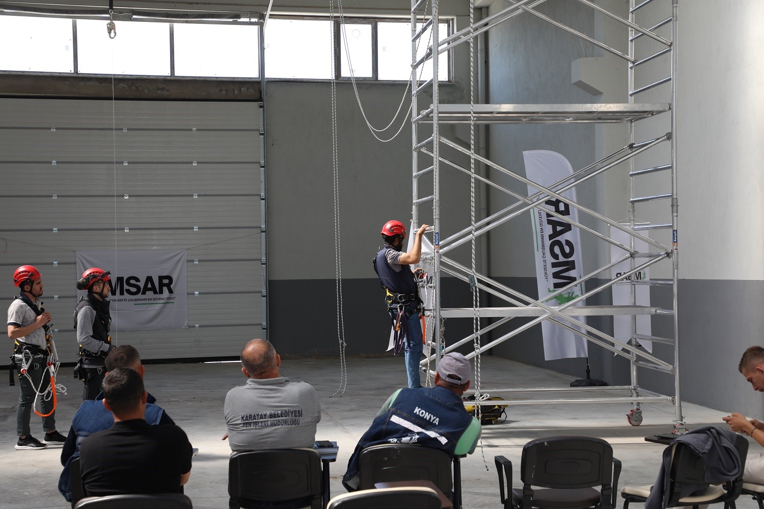 Bu doğrultuda yürütülen çalışmalar kapsamında Karatay Belediyesi tarafından personele yönelik "Yüksekte Çalışma Eğitimi" ile "Güvenli Sürüş Eğitimi" gerçekleştirildi. Temizlik, budama ve teknik ekiplerde görev yapan personele yönelik düzenlenen Yüksekte Çalışma Eğitimi, Eğitmen Gökhan Oğuztürk tarafından verildi. Eğitimde, yüksekte çalışırken iş sağlığı ve güvenliği mevzuatına uygun olarak güvenli bir çalışma ortamının nasıl sağlanacağı detaylı şekilde anlatıldı. Ayrıca; doğru ekipman kullanımı, risk değerlendirmesi ve muhtemel tehlikelere karşı alınması gereken önlemler uygulamalı olarak gösterildi.