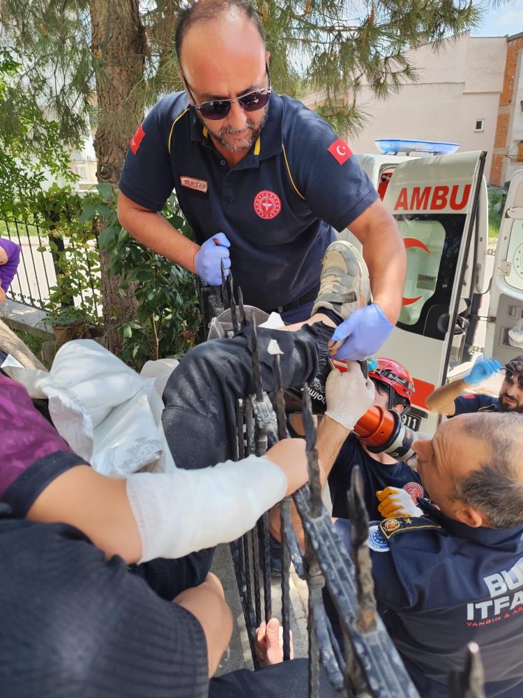 Olay, saat 14.00 sıralarında Fatih Mahallesi Erdoğdu Sokak'ta bulunan 3 katlı apartmanın bahçesinde meydana geldi. Oyun oynayan 11 yaşındaki A.O., bahçe duvarının üzerinden atlamaya çalıştığı sırada, sağ bacağı koruma demirine saplandı. Duvarda asılı kalan çocuğu gören vatandaşlar, itfaiye ekiplerine haber verdi. Olay yerine gelen ekipler, koruma demirlerini demir kesme makinesiyle kesti. Yarım saat süren çalışma sonucu kurtarılan çocuk, bacağına giren demirle ambulansa alınıp İnegöl Devlet Hastanesine kaldırıldı. A.O., bacağındaki demirin çıkarılması için ameliyata alındı. Yaralının sağlık durumunun iyi olduğu öğrenildi.