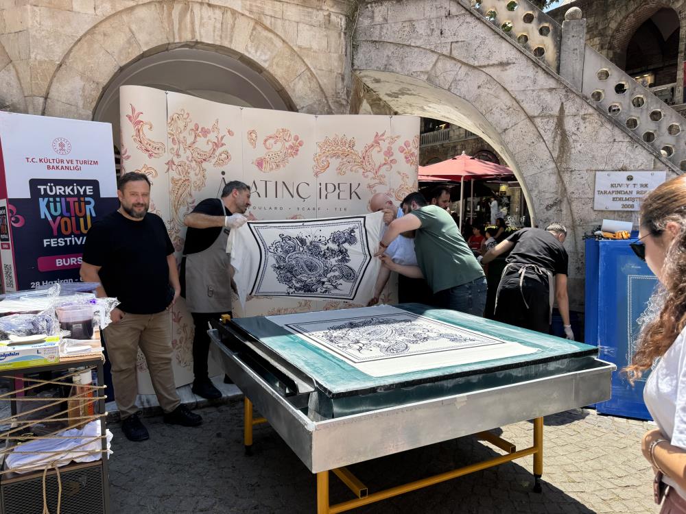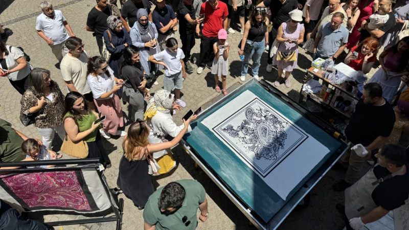 Geleneksel masa baskısı atölye çalışmasında, ustalarla birlikte rakle çeken vatandaşlar, birbirinden güzel desenlerin basıldığı ipek kumaşların kurumasını ve ortaya çıkan görsel şöleni hayranlıkla izledi.