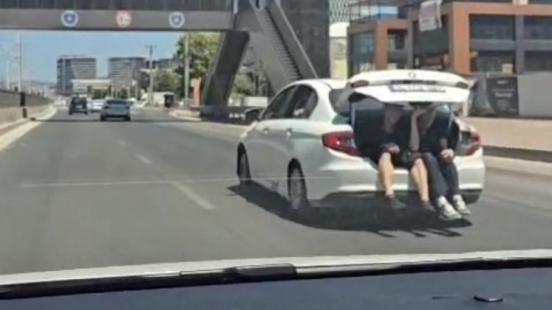 Osmangazi ilçesi İstanbul Yolu üzerinde seyir halindeki bir otomobilde yolcular bagajda taşındı. Bagaj kapısının da açık olduğu görülürken yolcular düşmemek için kapıya tutundu. Kilometrelerce süren tehlikeli yolculuk başka bir sürücünün kamerasına saniye saniye yansıdı.