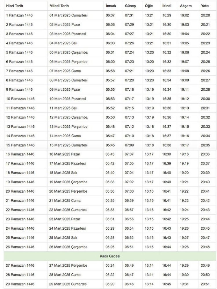 2025 yılı Ramazan ayı, 1 Mart Cumartesi günü başlayacak ve 30 Mart Pazar günü sona erecek.