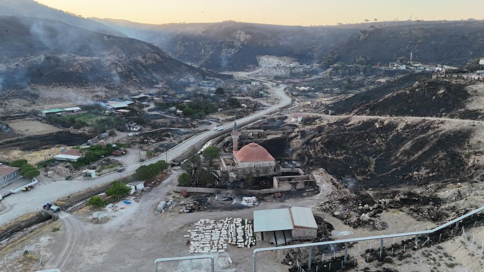 Yangında yanan ormanlık alanlar ile yerleşim yerleri dron ile görüntülendi.