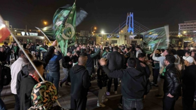 Körfez temsilcisinin formalarını giyen, ellerindeki bayraklarla kutlama yapan taraftarlar, takımlarının marşlarını söyledi.