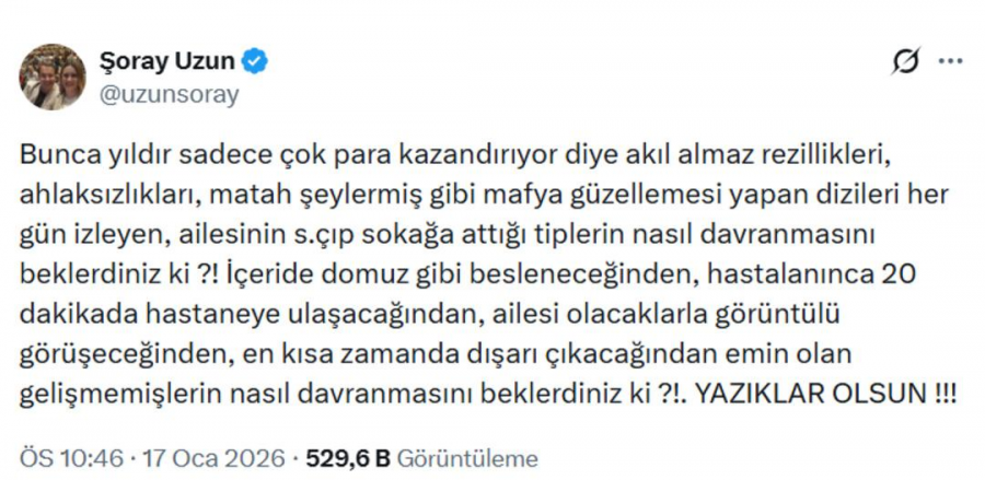 Şoray Uzun yaptığı paylaşımda "Bunca yıldır sadece çok para kazandırıyor diye akıl almaz rezillikleri, ahlaksızlıkları, matah şeylermiş gibi mafya güzellemesi yapan dizileri her gün izleyen, ailesinin s.çıp sokağa attığı tiplerin nasıl davranmasını beklerdiniz ki" diyerek isyan etti.