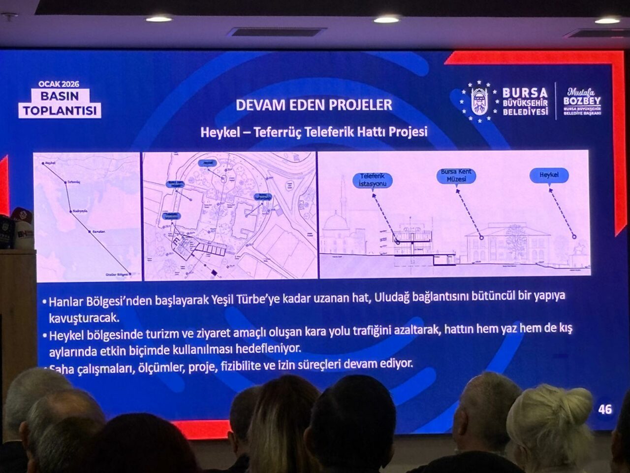Burada bölgeyi hareketlendirmek amacıyla böyle bir projemiz var. İzinleri almaya çalışıyoruz. Hanlar Bölgesi’nden başlayarak Yeşil Türbe’ye kadar uzanan hat, Uludağ bağlantısını bütüncül bir yapıya kavuşturacak. Heykel bölgesinde turizm ve ziyaret amaçlı oluşan kara yolu trafiğini azaltarak, hattın hem yaz hem de kış aylarında etkin biçimde kullanılması hedefleniyor.”