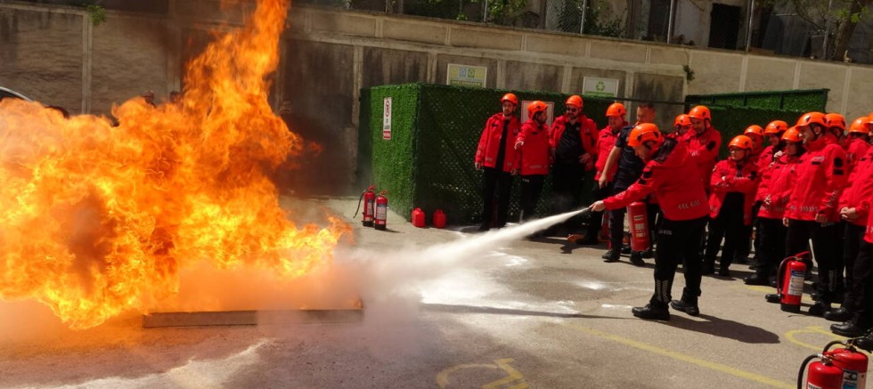 Personel, aldığı eğitim doğrultusunda, itfaiye ekipleri tarafından kontrollü olarak yakılan ateşe müdahale etti. (DHA)