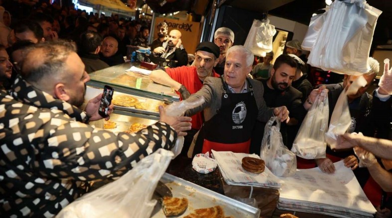 Bursa Büyükşehir Belediye Başkanı Mustafa Bozbey’in sosyal medyadan yaptığı “Sahurda Abdal Meydanı’nda Buluşuyoruz” paylaşımıyla yüzlerce Bursalı Abdal Meydanı’ndaki tarihi fırının önüne geldi. Gençler tarafından meşalelerle karşılanan Başkan Mustafa Bozbey, vatandaşlarla sohbet edip bol bol hatıra fotoğrafı çektirdi. Daha sonra önlüğü giyerek tezgahın başına geçen Başkan Bozbey, meydanı dolduranlara tahanlı pide, börek ve simit ikram etti.