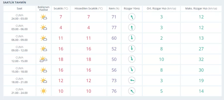 Haftanın son tahmin gününde sıcaklıklar tekrar cuma günkü seviyelerine dönüyor. En yüksek 18°C, en düşük ise 4°C olması beklenen salı günü, nem oranının %86'lara çıkmasıyla sabah saatlerinde daha nemli bir hava ile karşılaşabiliriz.