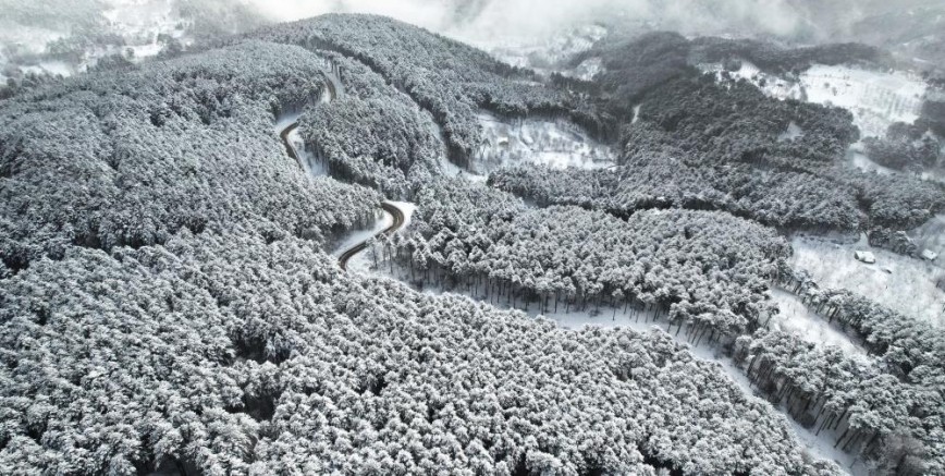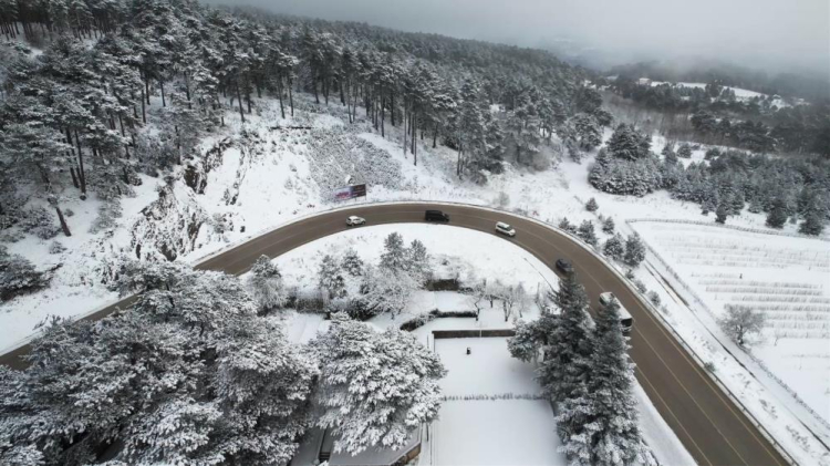 Kış mevsiminin etkisiyle beyaza bürünen ormanlık alanlar arasında ilerleyen yollar, havadan çekilen görüntülerde kartpostallık kareler oluşturdu.