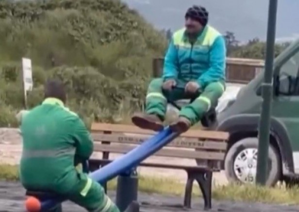 Osmangazi ilçesinde görev yapan temizlik personeli, çalışma sırasında parkta bulunan tahterevalliye binerek kısa süreli eğlendi. O anlar cep telefonu kamerasına yansırken, görüntüler sosyal medyada da ilgi gördü.