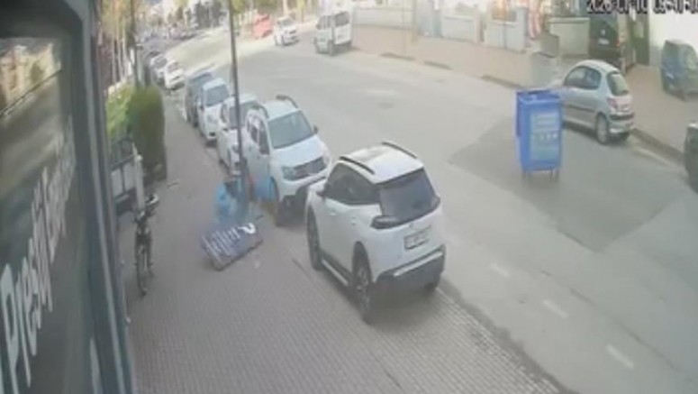 Aynı anlarda lodosun etkisiyle bir çöp kutusunun da sürüklendiği görüldü. Yaşanan tehlikeli anlar, çevredeki bir iş yerinin güvenlik kamerasına yansıdı.