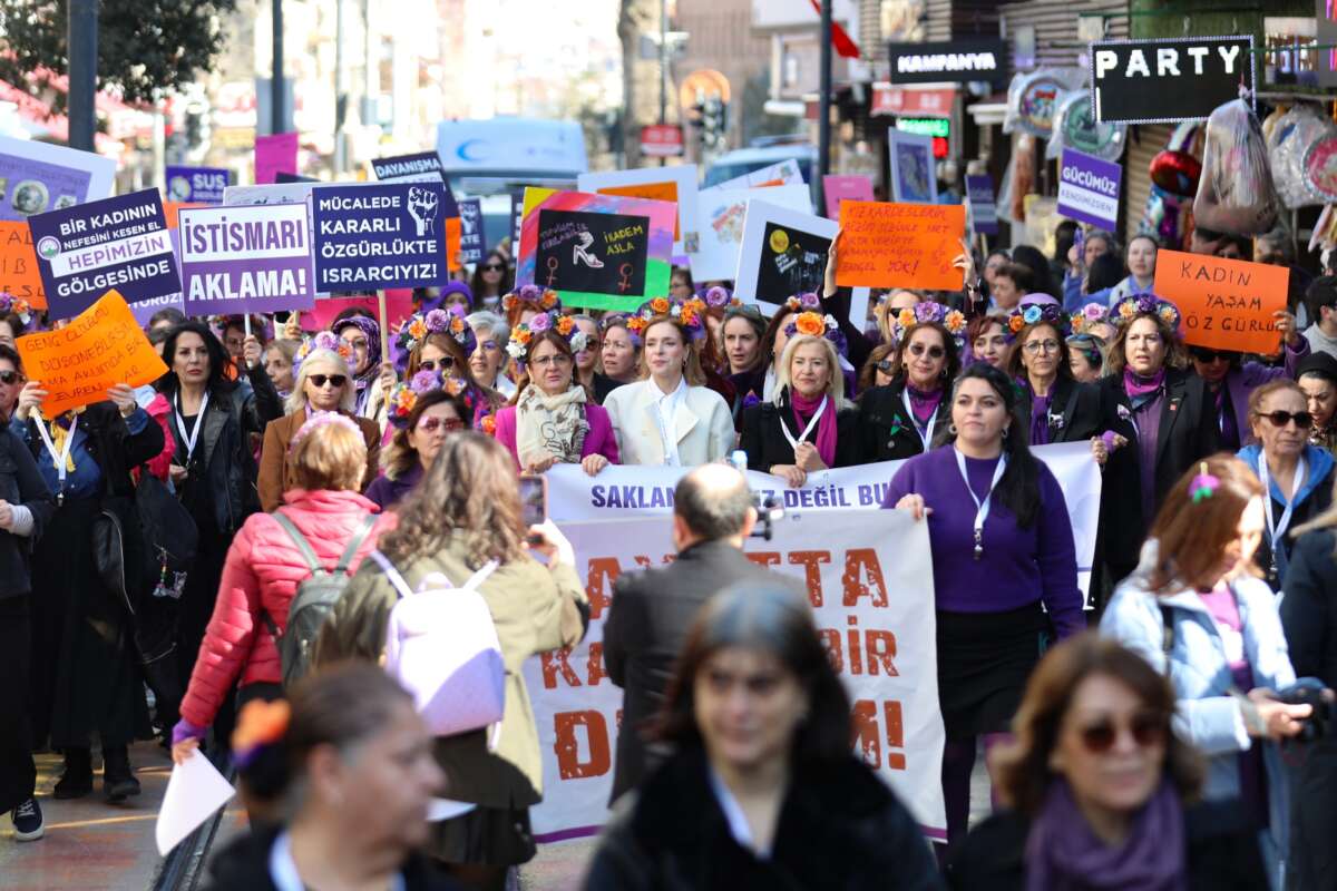 Cumhuriyet Caddesi’nden Hanlar Bölgesi’ne kadar yürüyen Bursalı kadınlar, 8 Mart Dünya Kadınlar Günü etkinlikleri kapsamında ‘Saklandığımız değil, Buluştuğumuz yerdeyiz. Biz birbirimizin çaresiyiz’ mesajını verdi. Ellerinde ‘İstismarı aklama! Asla yalnız yürümeyeceksin!’ yazılı döviz, afiş ve pankartlar taşıyan kadınlar, ‘Yaşasın kadın dayanışması’ sloganları atarak görünmez kılınmalarına, emeklerinin değersizleştirilmesine, şiddete ve ayrımcılığa karşı dayanışma mesajı verildi. Etkinliğe katılanlara rozet ve toka dağıtılırken, kadınlar saçlarına taktıkları çiçeklerle caddeyi adeta renk cümbüşüne çevirdi.