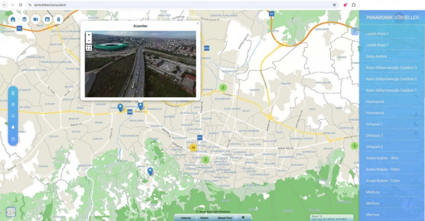 3 Boyutlu Kent Rehberi ile harita üzerinden adres, önemli mekanlar, yeşil alanlar ve ulaşım bilgilerine hızlıca erişilebiliyor. Bursa’yla ilgili tüm mekansal verileri tek bir platformda buluşturan uygulamada, nöbetçi eczaneler, Wi-Fi noktaları, BESAŞ satış noktaları, BUSKİ hizmet noktaları, BUDO ve BBBUS, otoparklar, pazar alanları, günlük kazı çalışmaları, acil durum toplanma alanları yer alıyor. Ayrıca şehir kameraları, panoramik görüntüler, su kesintileri ve etkinlikler gibi dinamik verilere de anlık olarak erişilebiliyor. Böylece kullanıcılar kentle ilgili güncel gelişmelerden anında haberdar olabiliyor. Bursa’nın simge yapıları ve dokusu da 3 boyutlu olarak incelenebiliyor.