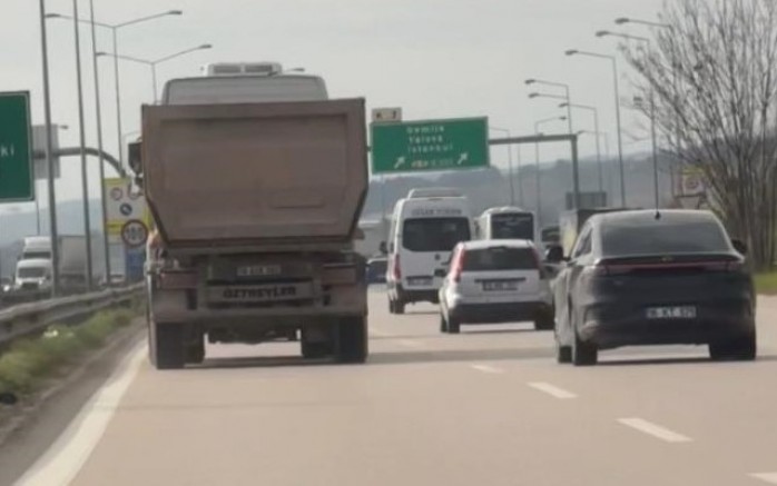 Bursa Çevre Yolu'nda seyir halinde olan bir hafriyat kamyonu, uzun araçların geçişine yasak olan en sol şeride girerek bir süre ilerledi. Kamyon sürücüsü trafik güvenliğini tehlikeye düşürerek, süratli şekilde yoluna devam etti.