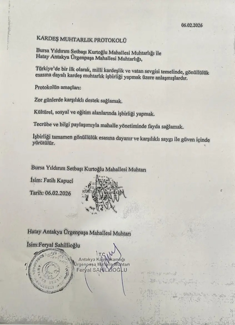“Asrın felaketi” olarak nitelendirilen ve 11 ili etkileyen 7,7 ve 7,6 büyüklüğündeki depremlerin yıl dönümünde atılan imzalarla, İki mahalle arasında imzalanan “Kardeş Muhtarlık İşbirliği Protokolü” yapıldı.