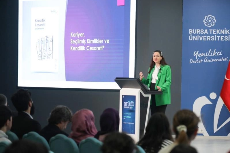 Alanında uzman isimleri her çarşamba günü Bursa Teknik Üniversitesi (BTÜ) öğrencileriyle buluşturan BTÜ Konuşmaları’nın 3’ncü sezon 24’ncü bölüm konuğu, Yazar Zeynep Merdan oldu. Mimar Sinan YerleşkesiTurkuaz Salon’da gerçekleştirilen programa; BTÜ Rektörü Prof. Dr. Naci Çağlar, Genel Sekreter Selim Uzun, akademisyenler ve öğrenciler de katıldı. “Kariyer ve Kendilik Cesareti” başlıklı konuşmasıyla Merdan;gerçek benliği bulmak, hakiki arzu, varoluş imkânları gibi konulardan bahsetti. Felsefe, psikoloji, sosyoloji ve edebiyatın dünyaca ünlü isimlerinin hayat hikâyelerinden ve benliğe bakış açısından örnekler veren Merdan, insanın kimliğini seçmesinin ve gerçek benliğini bulmasının çok önemli olduğunu vurguladı. Benliği tanımlamanın çok farklı boyutları olduğunu kaydeden Yazar Merdan, “Kimdir ben sorusunu sorarken bunun, felsefik, sosyolojik, psikolojik ve edebi yönü vardır. Biz, bize verili olan pek çok şeyi kendimiz seçmedik, cinsiyet, din, dil, ırk Bunların hiçbiri ben değildir, sadece benimizden birer parçadır. İnsanın ideolojik görüşü ya da doğduğu yer ile tanımlanması, onun kimliğini tanımlamaya yetecek şeyler değildir” diye konuştu.