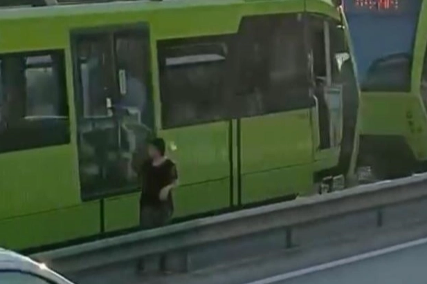 Telde yürüyen şahsın yanından geçen metro ise yürekleri ağza getirdi.