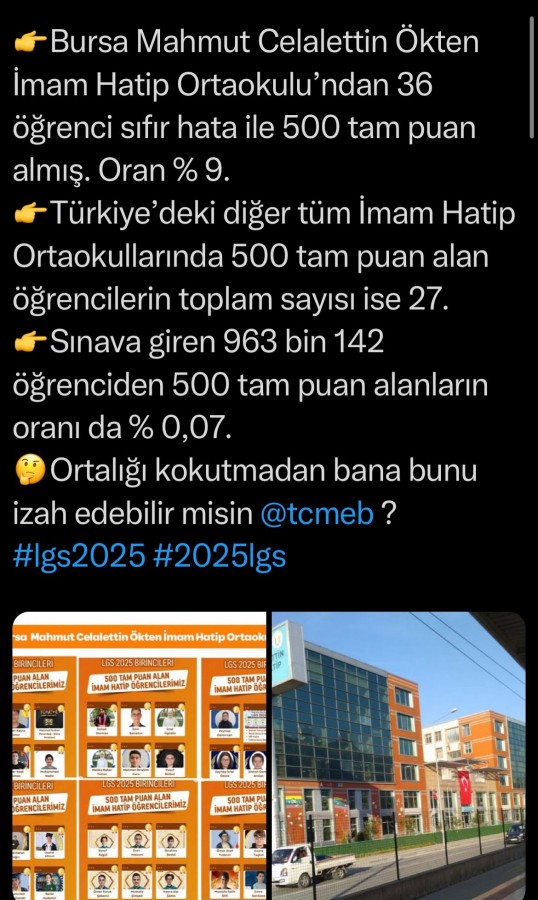 Ancak, okulun sosyal medyada paylaştığı görselde, Türkiye genelindeki İmam Hatip Ortaokulları arasında 500 tam puan alan öğrencilerin bilgileri yer alıyordu.