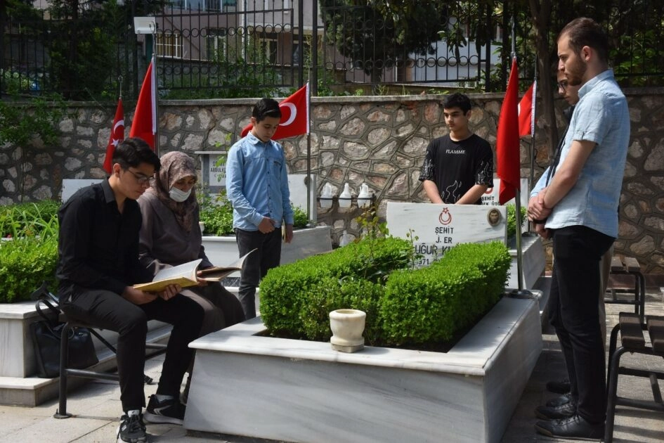 Şehit aileleri ile birlikte Pınarbaşı Garnizon Şehitliği’ni ziyaret eden gençler, milletin bekası, devletin devamı için kendi hayatlarını hiçe sayarak şehadete ulaşan şehitler için Kur’an-ı Kerim okudu.
