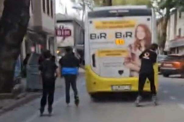 İnegöl’de patenli gençlerin otobüs arkasında tehlikeli yolculuğu yüreklerini ağızlara getirirken, gençlerin rahat tavırları ise gözlerden kaçmadı.