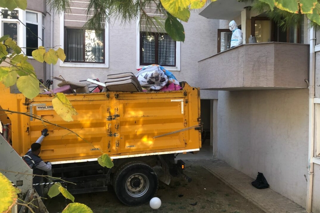 Gerekli yasal izinlerin alınmasının ardından başlatılan temizlik çalışmasında, Belediye Temizlik İşleri Müdürlüğü ekipleri evden bir kamyon dolusu çöp çıkardı.