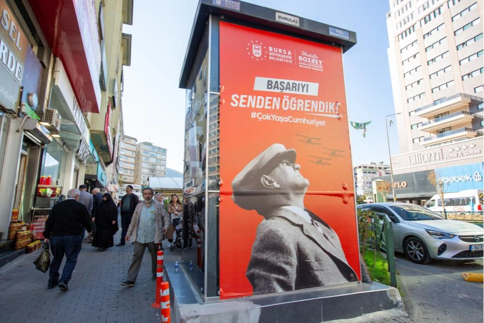 29 Ekim Cumhuriyet Bayramı’nın 101. yıl dönümü, Büyükşehir Belediyesi tarafından hazırlanan zengin içerikli programlarla kutlanıyor. Özel olarak hazırlanan ‘Cumhuriyet Tırı’ ile Bursalılara Cumhuriyet Bayramı heyecanını yaşatan Büyükşehir Belediyesi, şehrin dört bir yanını da ‘Senden Öğrendik’ temalı afiş ve billboardlarla süsledi. 29 Ekim kapsamında spordan kültür ve sanata kadar birçok etkinliğe imza atacak olan Büyükşehir Belediyesi, 17 ilçede hazırlanan ‘Senden Öğrendik’ temalı afiş ve billboardlarla Bursalılara şimdiden Cumhuriyet coşkusunu yaşatıyor.