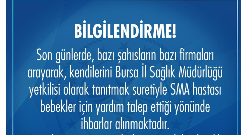 "Son günlerde, bazı şahısların bazı firmaları arayarak, kendilerini Bursa İl Sağlık Müdürlüğü yetkilisi olarak tanıtmak suretiyle SMA hastası bebekler için yardım talep ettiği yönünde ihbarlar alınmaktadır. Firmaların veya vatandaşlarımızın dolandırıcılık amaçlı bu tür taleplere itibar etmemelerini rica ederiz".