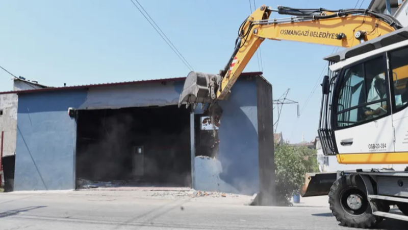 Osmangazi Belediyesi, ilçenin dört bir yanındaki kaçak binaları tespit ederek yıkıyor. Yapı Kontrol Müdürlüğü ekipleri tarafından Geçit Mahallesi'nde ruhsatsız olduğu belirlenen iş yeri, yasal işlemlerinin tamamlanmasının ardından iş makinesi ile yıkıldı.