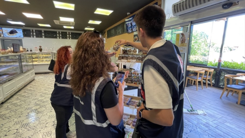 Dinlenme tesisinin kafe bölümünde fiyat listelerinin görünür şekilde işletmenin önüne ve masaların üzerine konulup konulmadığını kontrol eden ekipler, market bölümündeki bazı ürünlerin fiyat etiketi ile raf ve kasa fiyatını karşılaştırdı.