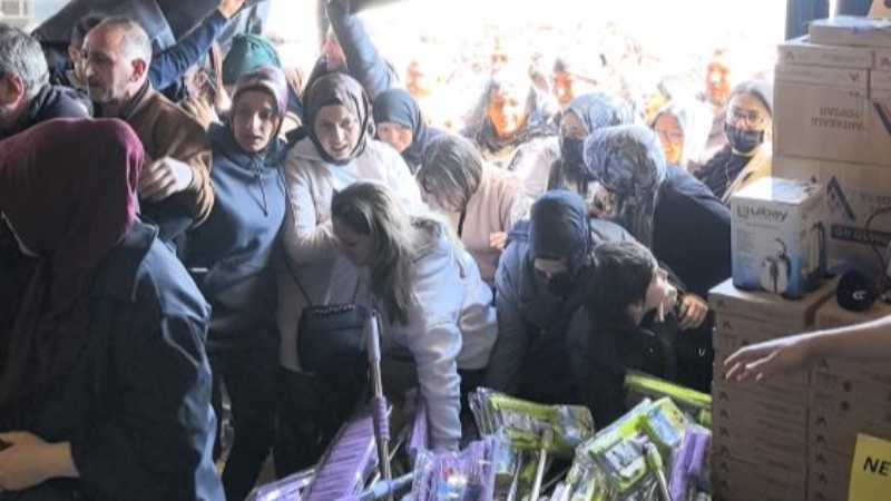 Bursa'nın İnegöl ilçesinde her şeyin 100 TL'ye satıldığı indirim mağazası açıldı. Açılan mağazada vatandaşlar ürünleri alabilmek için Alanyurt yolundaki iş yerinin önünde saatlerce beklediler. Yüzlerce vatandaş, kapıların açılması ile birlikte birbirlerini ittirerek içeri girmeye çalıştılar. Kapıların açılmasıyla birlikte izdiham yaşanırken vatandaşlar adeta birbirlerini ezdi.