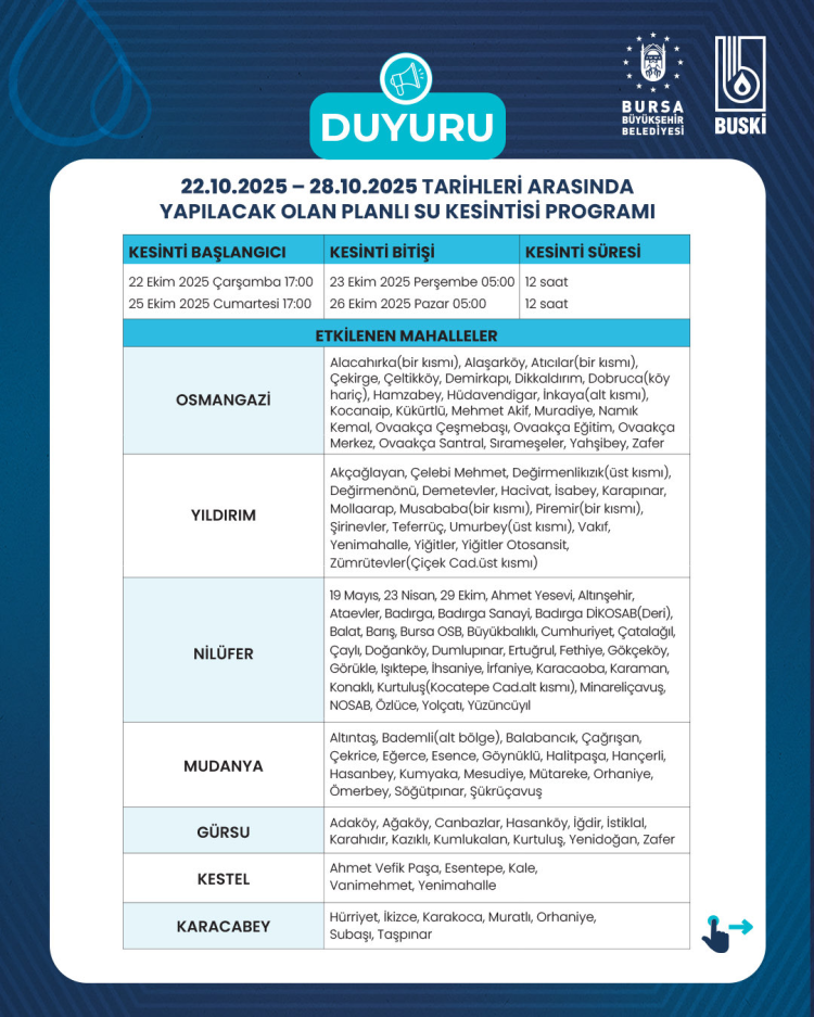 Bu nedenle Bursa Su ve Kanalizasyon İdaresi (BUSKİ) Genel Müdürlüğü, kentte 22 Ekim-28Ekim 2025 tarihleri arasında planlı su kesintisi uygulanacağını duyurdu.