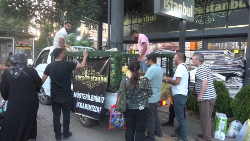 Bursa'da bir zücaciye mağazası, sıcak yaz günlerinde bunalan vatandaşlara serinlemeleri için ücretsiz karpuz dağıttı. Mağazaların önünde 4 kamyon, yaklaşık 20 tonu bulan karpuzlar 25 dakika içinde tükendi. Mağaza sahibi Bekir Yetişen, "Yıllardır bizimle alışveriş yapan müşterilerimizin bu sıcak yaz günü akşamında serinlemelerini istedik" dedi.