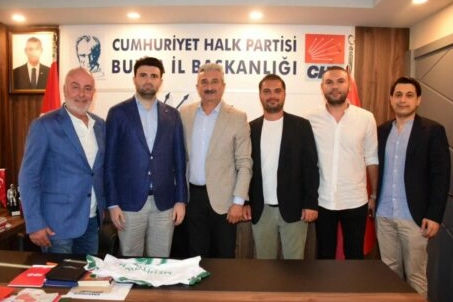 Ziyarette, Bursaspor Başkanı Enes Çelik tarafından CHP İl Başkanı Nihat Yeşiltaş’a Bursaspor forması hediye edildi.