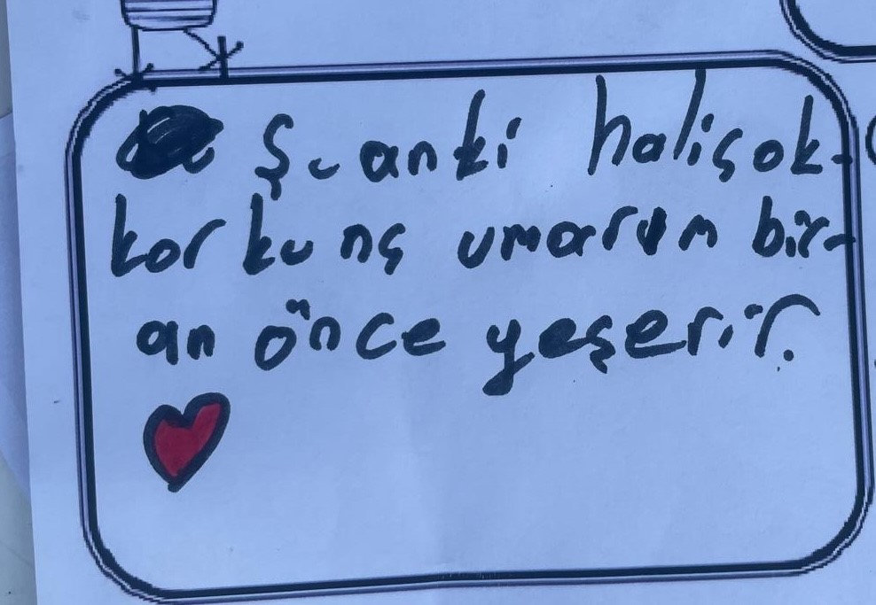"Psikolog ve çocuk gelişim uzmanlarımızla geldik. Çocukların bazı talepleri oldu. Su oyunu ve futbol turnuvası istediler. Annelerle görüştük; çocuklarının yangından çok etkilendiğini söyledi. Çocuklarla sohbet ediyoruz. Etkinlikler düzenliyoruz süreci daha kolay atlatmaları için destek oluyoruz. Getirdiğimiz boyamalarda ormanlarla ilgili düşüncelerini yazdılar. 'Şimdi çok gri umarım yakın zamanda yeşil olur' diye yazanlar var. Çocuklar gri rengi sevmedi."