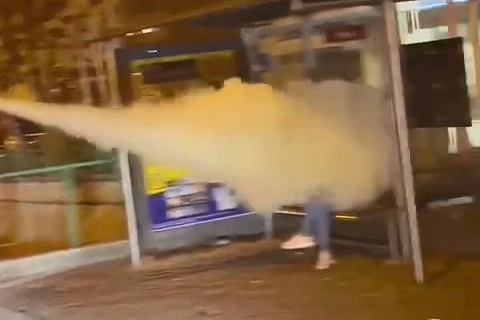 Olay, Merkez Osmangazi ilçesi Merinos Mahallesi mevkiinde meydana geldi. İzmir Yolu Caddesi üzerindeki otobüs durağında bekleyen kişiyi gören bir grup genç, açık kasa kamyonetle gelip bir süre durdu. Aracın kasasından yangın tüpü çıkaran kişiler durakta bekleyen şahsın yüzüne yangın söndürme tüpü sıkarak tozu dumana kattı. Hızla olay yerinden kaçan kişiler kameraya yansırken, o anlara kimse akıl sır erdiremedi.
