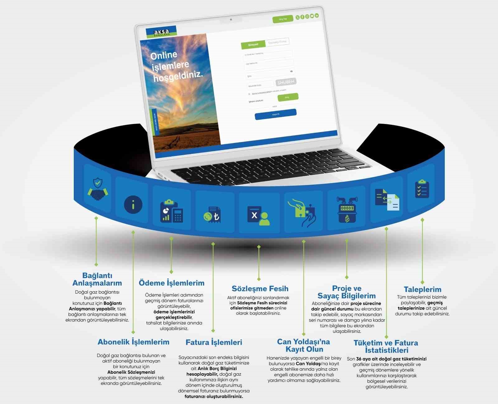Yapılan açıklamaya göre, hizmet verdiği bölgelerde abonelerini doğal gaz konforu ve ekonomisi ile buluştururken temiz hava sahasının oluşumuna katkı sağlayan şirket, hizmet kalitesinde ise en mükemmeli hedefliyor ve sürekli olarak iyileştirme çalışmaları gerçekleştiriyor. Şirketin bu bakış açısıyla devreye aldığı yeni Online İşlemler kanalında aboneler artık bağlantı anlaşmasını ve kullanım sözleşmesini oluştururken, geçmiş faturalarını sorgulayıp ödemesini anında yapabiliyor. Aboneler, tüm işlemleri Aksa Doğalgaz ofislerini ziyaret etmeden evlerinin konforunda tamamlayabiliyor.