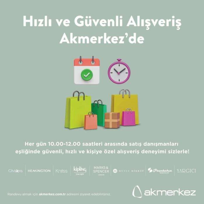 Kendilerini güvende ve özel hissetmeleri için geliştirilen Alışveriş Destek Uygulaması kapsamında misafirler akmerkez.com.tr web sitesi üzerinden aldığı randevularla yoğunluğun az olduğu 10:00 - 12:00 saatleri arasında seçili mağazalardan alışveriş yapabilecek.