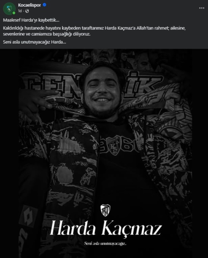''Maalesef Arda'yı kaybettik... Kaldırıldığı hastanede hayatını kaybeden taraftarımız Harda Kaçmaz'a Allah'tan rahmet; ailesine, sevenlerine ve camiamıza başsağlığı diliyoruz. Seni asla unutmayacağız Harda...'' denildi.