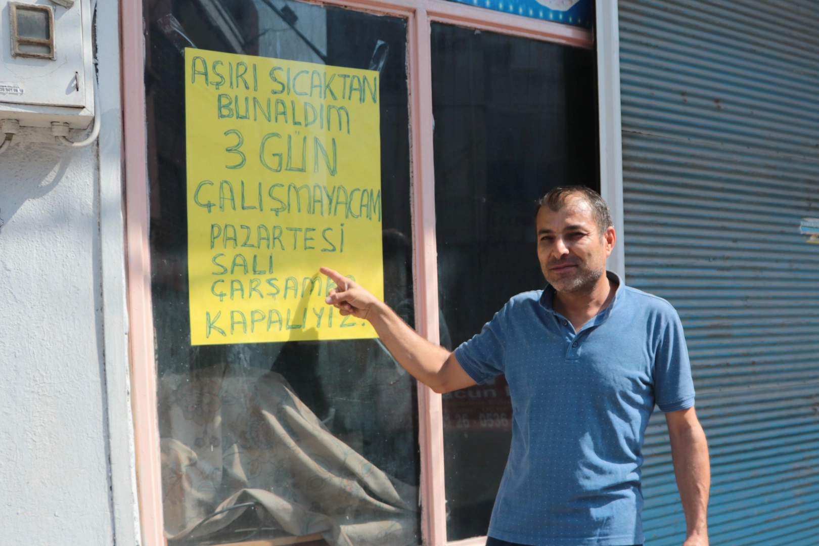 Hal böyle olunca birçok vatandaş evinden dışarı çıkmamaya başladı. Kentte uzun yıllardır fırıncılık yapan Ramazan Şeker (44) ise merkez Seyhan ilçesine bağlı Yeşilyurt Mahallesi’ndeki dükkanının camına, ‘Aşırı sıcaktan bunaldım. 3 gün çalışmayacağım Pazartesi, Salı ve Çarşamba kapalıyız’ yazısını yazıp Mersin’e denize gitti.