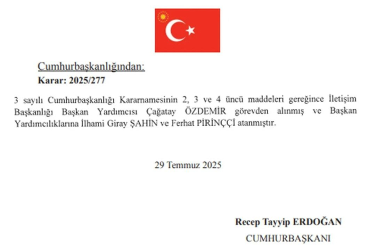 30 Temmuz 2025 tarihli ve 32971 sayılı Resmi Gazete yayımlandı. Cumhurbaşkanlığı İletişim Başkanlığı'nda 20 gün arayla yeniden üst düzey görevden alma ve atamalar yapıldı.