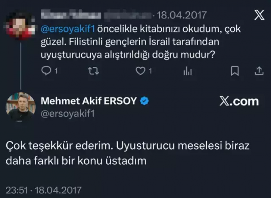 Olayın yankıları sürerken Mehmet Akif Ersoy'un 2017 yılında bir takipçisiyle aralarında geçen diyalog yeniden gündem oldu. Takipçisi "Öncelikle kitabınızı okudum, çok güzel. Filistinli gençlerin İsrail tarafından uyuşturucuya alıştırıldığı doğru mudur?" sorusunu yönelttiği Ersoy, "Uyuşturucu meselesi biraz daha farklı bir konu üstadım" cevabını ermişti.