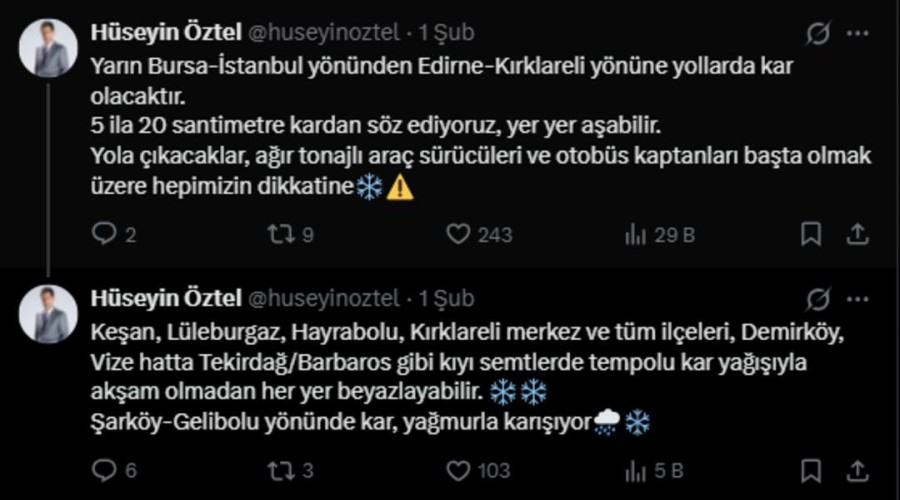 Öztel dün sosyal medya hesabından yaptığı paylaşımda "Yarın Bursa-İstanbul yönünden Edirne-Kırklareli yönüne yollarda kar olacaktır. 5 ila 20 santimetre kardan söz ediyoruz, yer yer aşabilir. Yola çıkacaklar, ağır tonajlı araç sürücüleri ve otobüs kaptanları başta olmak üzere hepimizin dikkatine" ifadelerini kullanarak uyarıda bulundu.