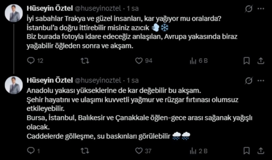Bugün tekrar açıklama yapan Öztel İstanbul'da Avrupa yakasında öğleden sonra ve akşam ve Anadolu yakası yükseklerinde kar görülebileceğini belirtti. Öztel paylaşımına şunları ekledi: "Şehir hayatını ve ulaşımı kuvvetli yağmur ve rüzgar fırtınası olumsuz etkileyebilir. Bursa, İstanbul, Balıkesir ve Çanakkale öğlen-gece arası sağanak yağışlı olacak. Caddelerde gölleşme, su baskınları görülebilir."